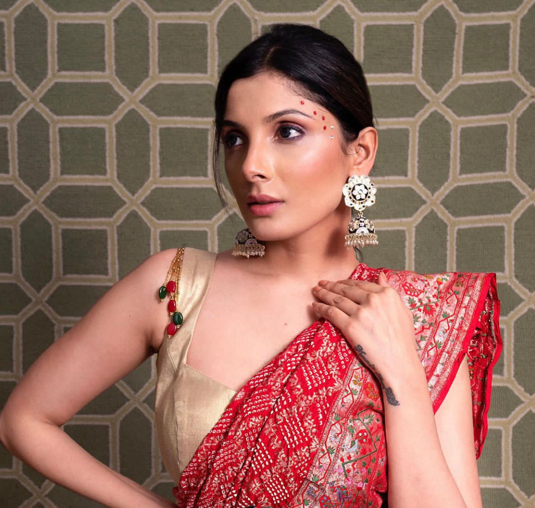 Crafted with precision and adorned with intricate black Meenakari work, these jhumka earrings are a true work of art. They bring a touch of traditional charm and a whole lot of fun to any outfit.